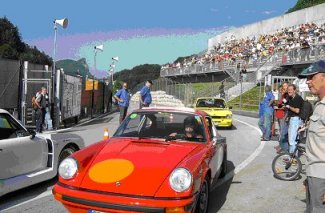 der als Photograph fungieren soll und ab geht´s gen Salzburgring. Um 6.30 Uhr rollen wir auf die Einfahrt Salzburgring zu, bekommen das grüne "Wapperl " das uns zur Einfahrt ins Fahrerlager berechtigt und schon sind wir mittendrin im Geschehen.